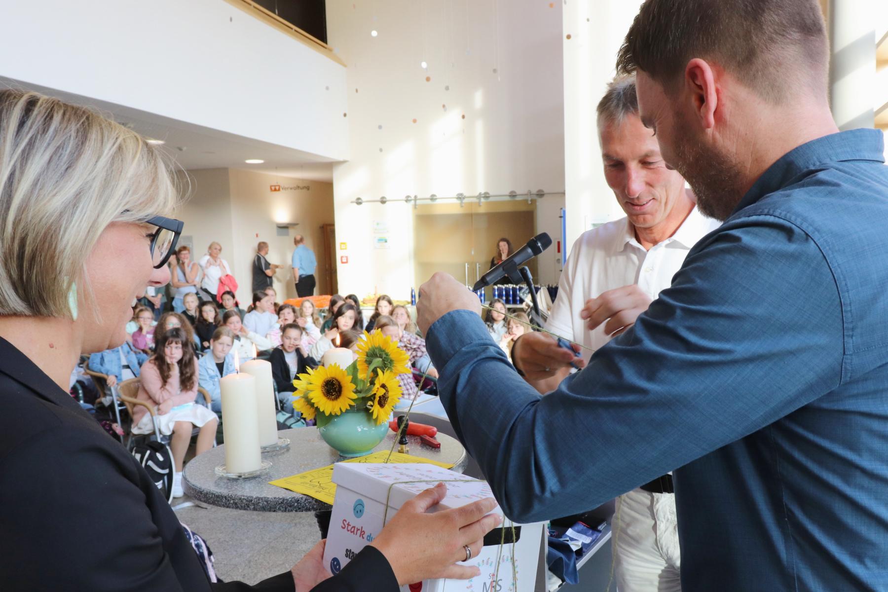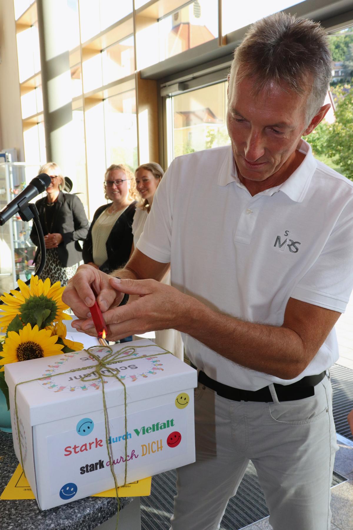 Schließlich erwartete die Mädchen der Höhepunkt der Feierstunde: All ihre schriftlich festgehaltenen ganz persönlichen Gedanken wurden durch Realschuldirektor Jürgen Moritz höchstselbst in einer „Zeitkapsel“ versiegelt und „konserviert“, welche bis zur Entlassung der Schülerinnen an der Schule verwahrt und erst bei der Entlassfeier am Ende der 10. Jahrgangsstufe „aktiviert“ wird. Dann nämlich werden die jetzigen Fünftklässlerinnen ihre aktuellen individuellen Eindrücke als „Inlay“ in der Zeugnismappe finden und nachlesen können.