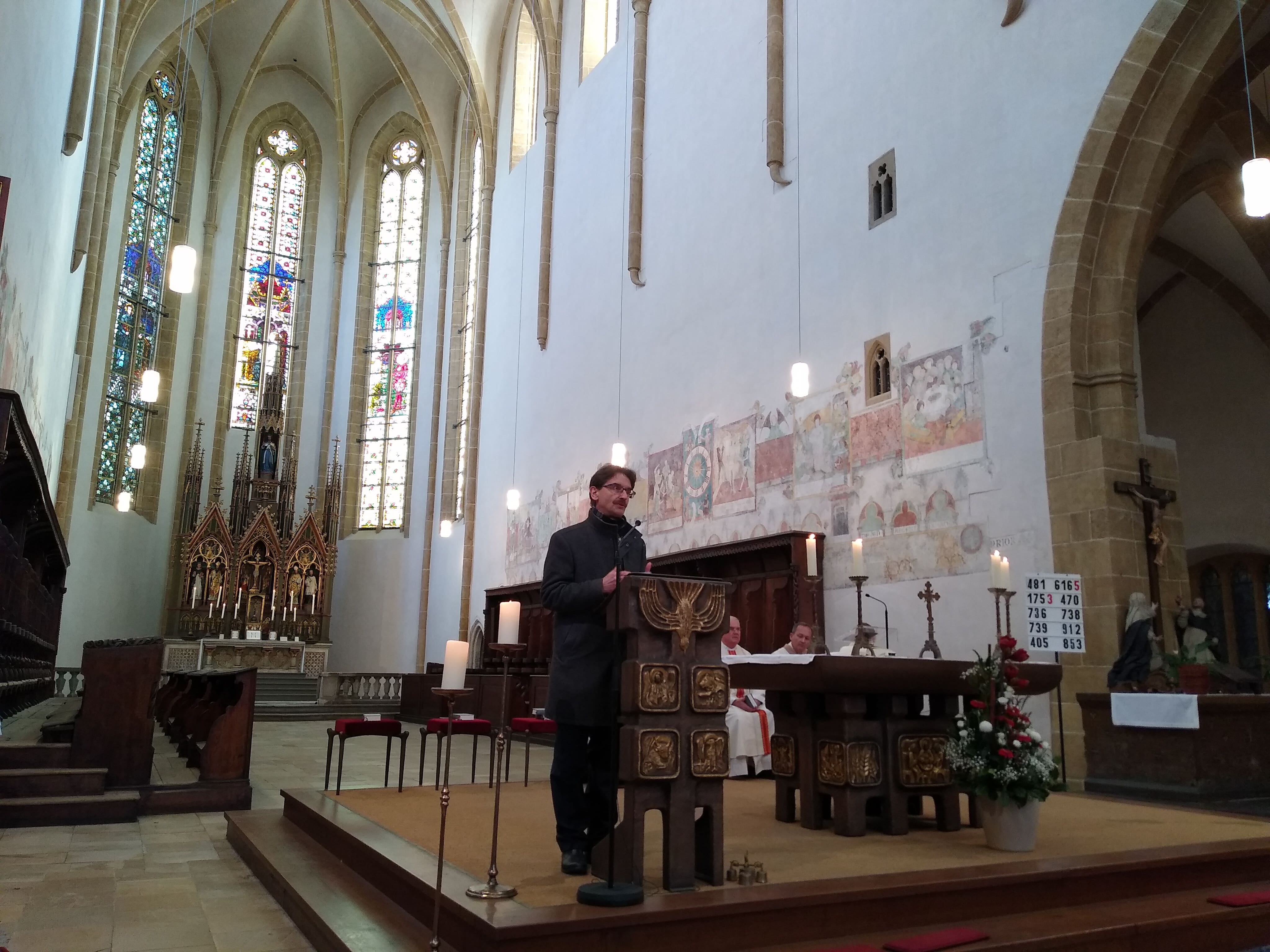 Eröffnet wurde der Lehrerfortbildungstag um 9 Uhr mit einem gemeinsamen Gottesdienst in der Dominikanerkirche St. Blasius. Domkapitular Msgr. Martin Priller, der der Heiligen Messe vorstand, ging in seiner Predigt auf das kürzliche erschienene Apostolische Schreiben Papst Leos XIV. über den Bildungsauftrag der Kirche – Disegnare nuove mappe di speranza – ein und verwies auf die katholischen Schulen als „Landkarten der Hoffnung“ in einer zunehmend säkularen Gesellschaft. Als Vorbild für die Lehrerinnen und Lehrer der Stiftungsschulen stellte Domkapitular Priller den heiligen Albertus Magnus in den Mittelpunkt, den ehemaligen Bischof von Regensburg, an dessen Festtag (15.11.) im Jahr 2002 die Schulstiftung gegründet worden ist.