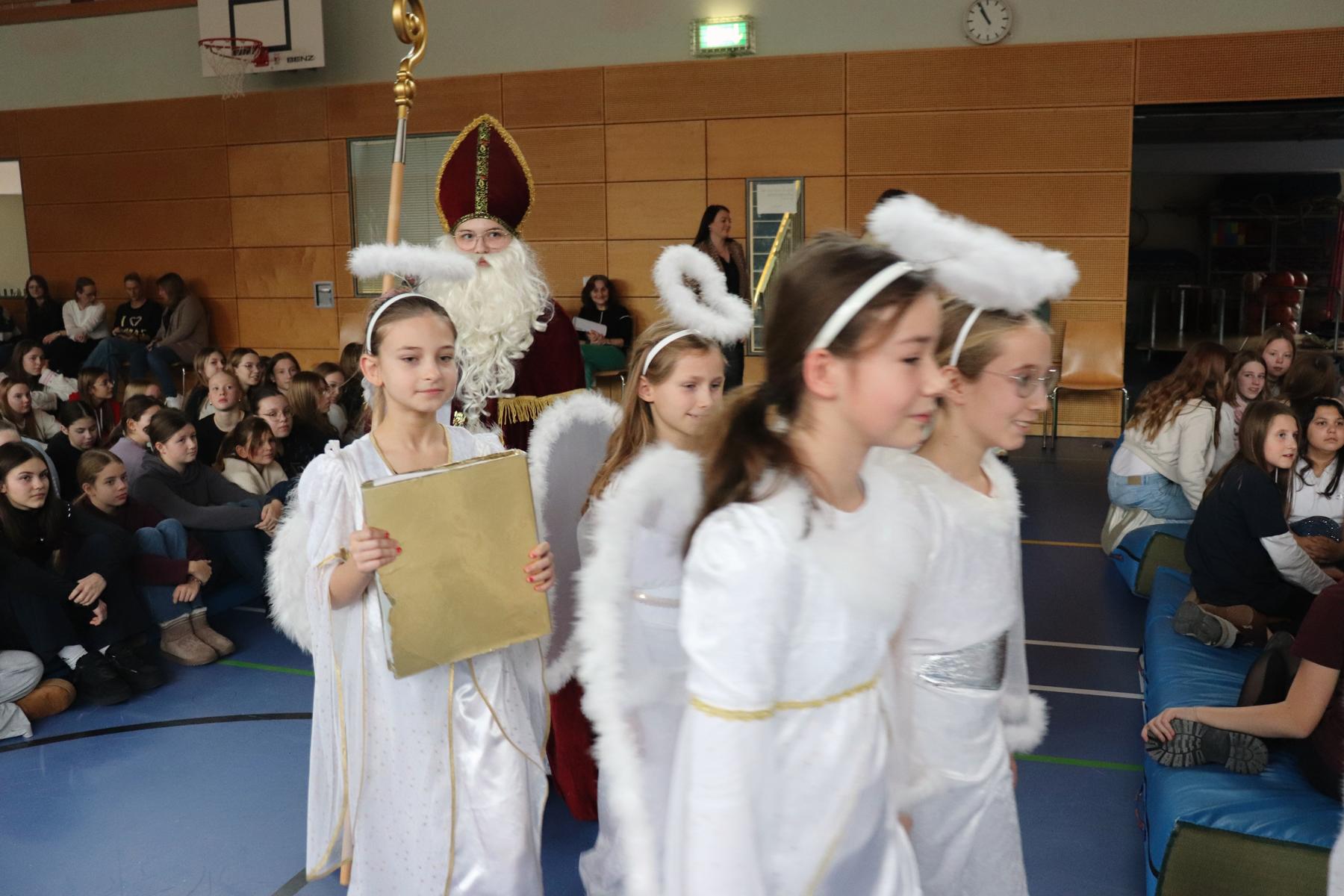 Alle Jahre wieder… auch in diesem Jahr stattete der heilige Nikolaus der Mädchenrealschule St. Josef wieder traditionell einen Besuch ab – diesmal aber bereits am 05.12. So versammelte sich die gesamte Schulfamilie ab 10.45 Uhr in der Sporthalle, um den Nikolaus und sein himmlisches Gefolge – bestehend aus seinen Engeln und natürlich dem Knecht Ruprecht - zu begrüßen.