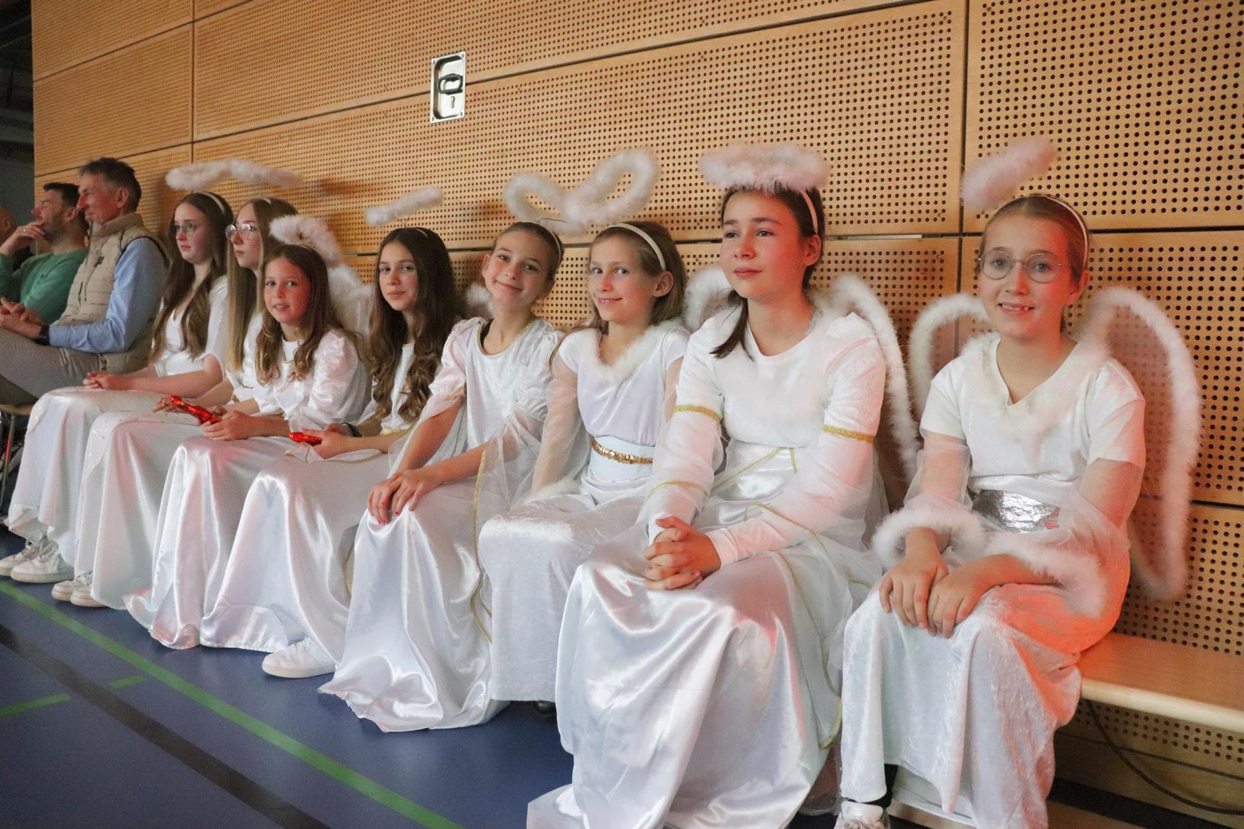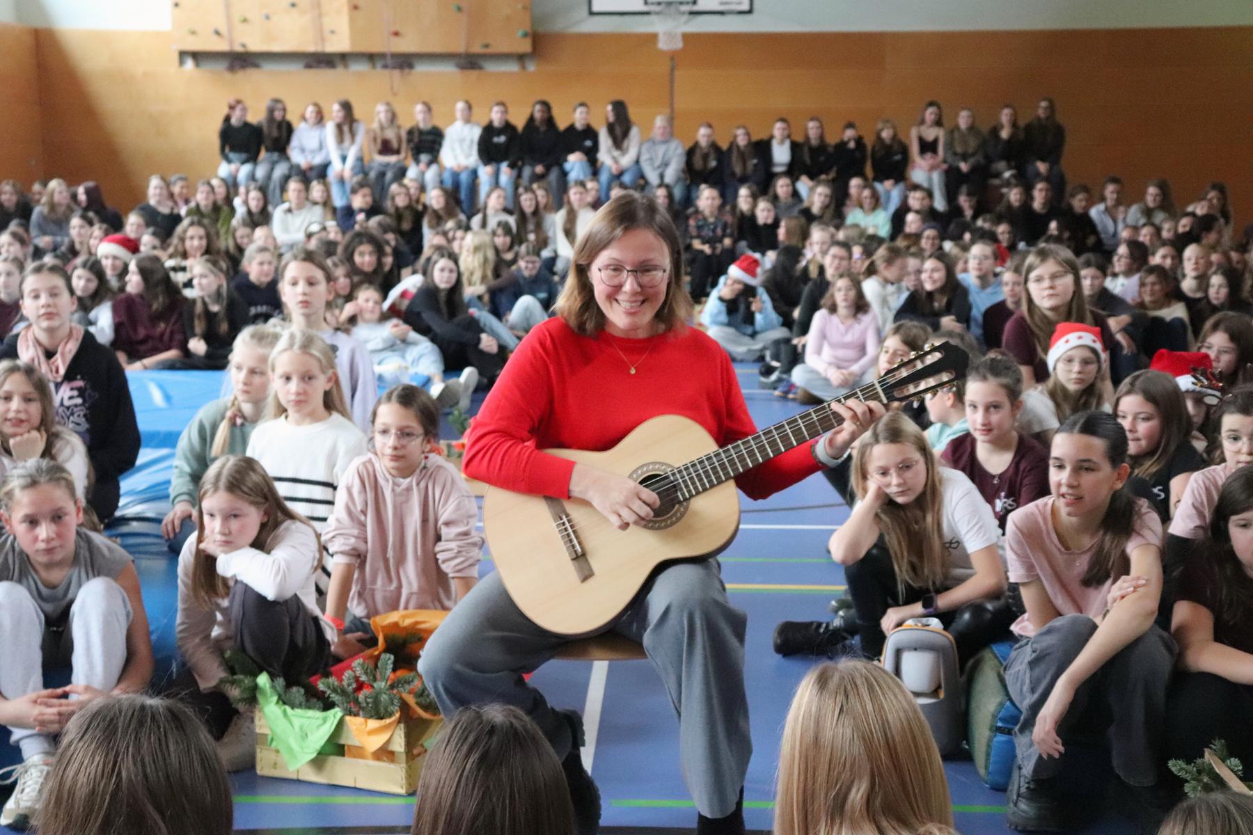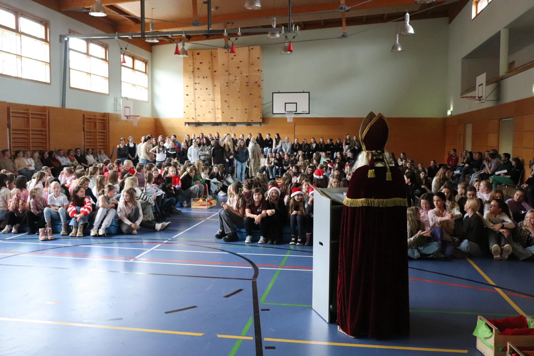 Im Anschluss folgte eine bunte Feier: Der Heilige Nikolaus fand viele lobende Worte für die Schülerinnen und Lehrkräfte und hatte auch für alle etwas Leckeres im Gepäck. Sportlich und musikalisch umrahmt wurde das Ganze von einem Beitrag der Klasse 5c, die unter der Leitung von Frau Wutz einen Tanz einstudiert hatte. Daneben gab es auch eine musikalische Einlage der Klasse 6b, die unter der Leitung von Frau Schmidt einen Cup-Song präsentierte, und eine Showeinlage der Seiltanzgruppe, ebenfalls unter der Leitung von Frau Wutz. Aber auch die Lehrkräfte brachten sich gerne in die Gestaltung der Feier ein und trugen das Lied „Advent is a Leucht’n“ vor, welches sie zuvor mit Frau Schmidt eingeübt hatten.