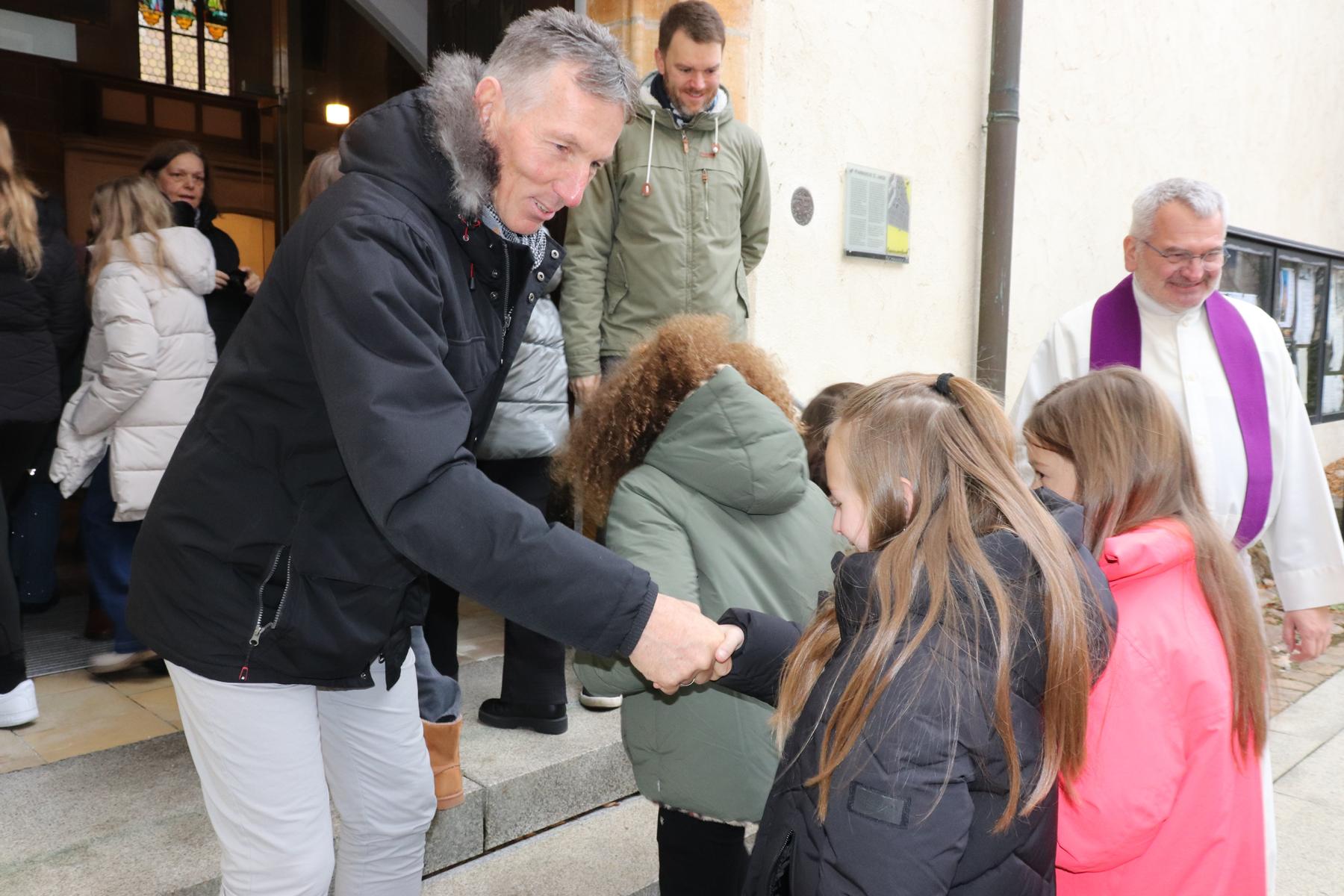 Zur Begrüßung gleich am Kirchenportal der Stadtkriche St. Jakob ein Lächeln mit Händedruck von Pfarrer Kalis, Herrn Moritz und Herrn Burger für jede und jeden.