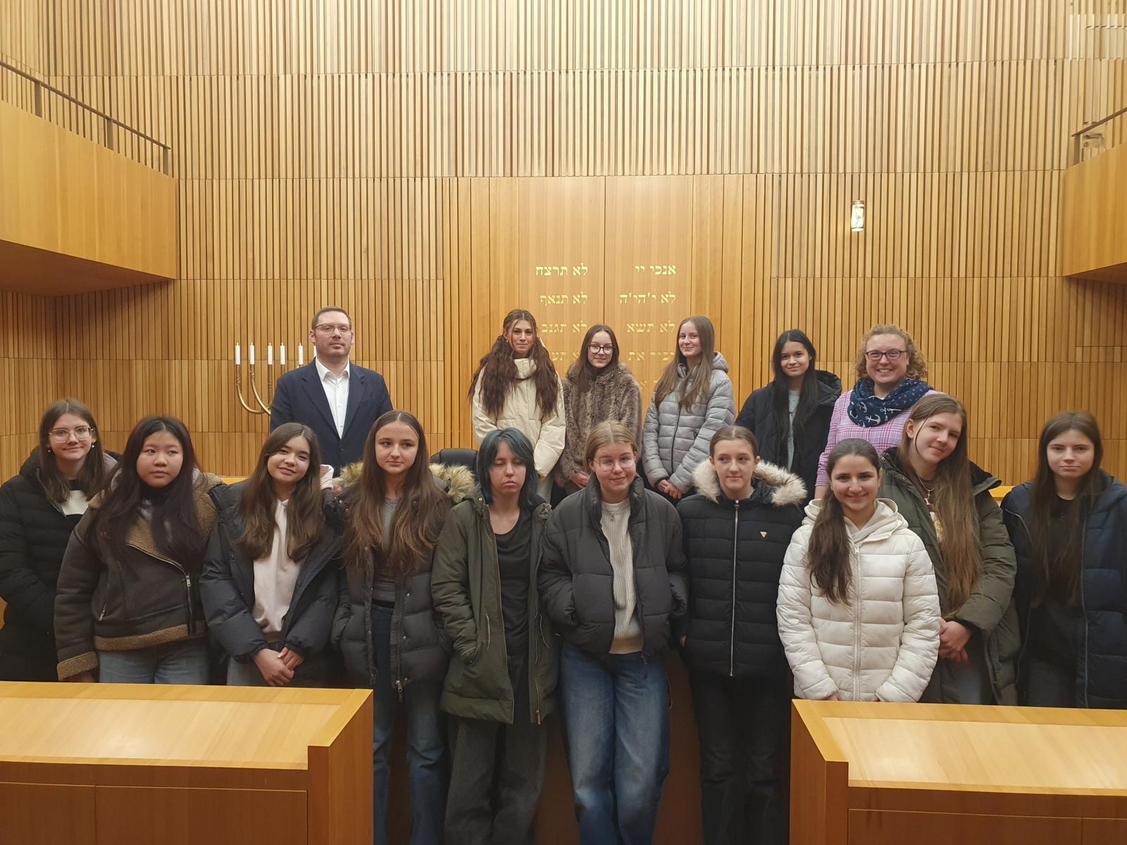 Die achten und neunten Klassen nutzen den Nachmittagsunterricht für eine Exkursion in die Synagoge nach Regensburg. Dort wurden sie von Religionslehrer Benjamin Kochan freundlich empfangen, nachdem sie die Sicherheitsschleuse bestaunt und durchlaufen hatten. Im Gebetsraum der Synagoge erklärte Herr Kochan die Grundlagen des Judentums. Die Schülerinnen konnten sich mit ihrem Grundwissen aus der Kurzarbeit gut ins Gespräch einbringen und freuten sich mit ihrem Wissen Eindruck zu erwecken. Herr Kochan rezitierte auch aus der Tora und erzählte vom gerade stattfindenden Chanukka Fest. Alle Fragen der Schülerinnen wurden geduldig beantwortet und ein kleiner Gang über den Christkindlmarkt rundete diesen interessanten Nachmittag ab.